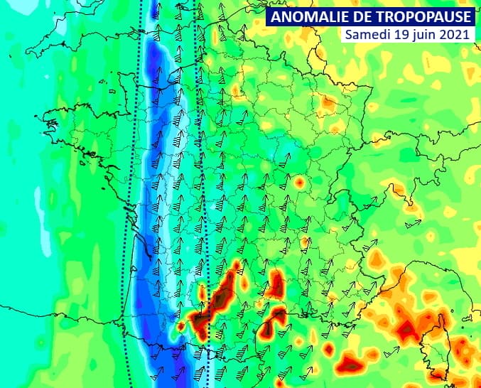 Depuis la fin de la semaine dernière, plusieurs anomalies de tropopause ont été observées sur la France, comme le montre la carte ci-dessus en soirée du samedi 19 juin 2021 où on distingue une anomalie pénétrant sur l'ouest de la France. En règle générale, la plupart des dégradations orageuses majeures sont liées à une ou plusieurs anomalies de tropopause qui sont elles-mêmes liées au comportement du courant jet.