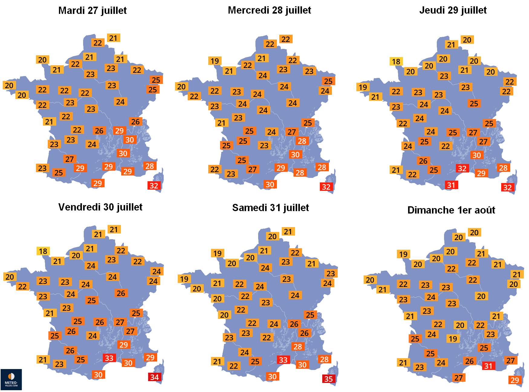 Températures maximales envisagées entre le mardi 27 et le dimanche 1er août 2021 - Météo-Villes
