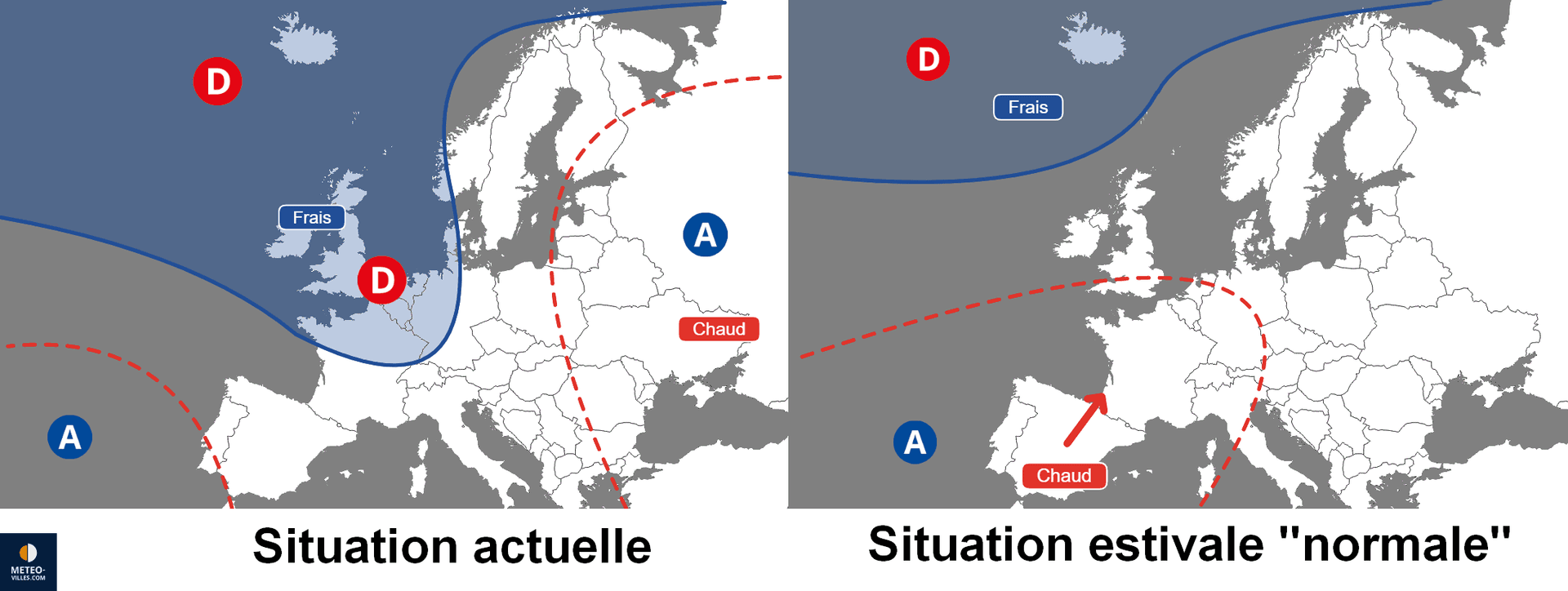 Les zones dépressionnaires, circulant normalement plus au Nord de l'Europe en période estivale, continuent de s'approcher de l'Ouest de l'Europe depuis le début de l'été, débordant plus ou moins vers nos régions et apportant un temps généralement perturbé et assez frais.
