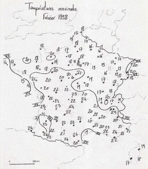 Néanmoins, la référence en terme d’épisode de douceur exceptionnelle reste néanmoins la fin du mois de février 1960. Sous un puissant flux de Sud/Sud-Ouest, une masse d’air tropicale est directement advectée vers la France, provoquant une envolée remarquable des températures sur une large partie du pays.