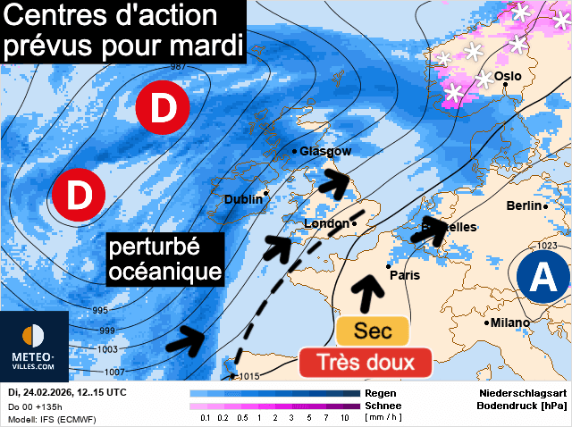 Centres d'action prévus pour la journée de mardi - modèle météo européen - carte retraitée par Wetteronline et Meteo-villes