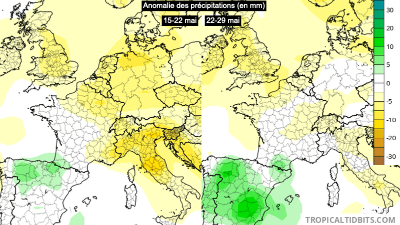 Anomalie des précipitations (en mm) du 15 au 22 mai et du 22 au 29 mai - modèle CFS via TropicalTidbits