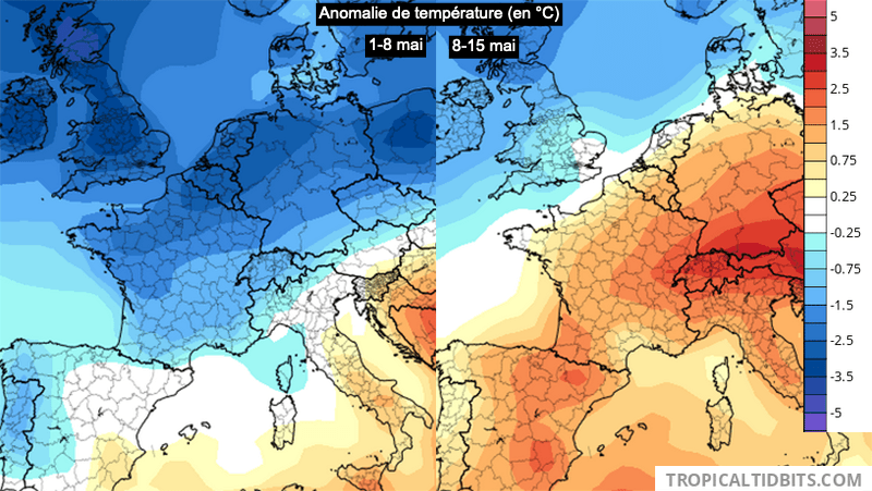 Anomalie de température (en °C) du 1 au 8 mai et du 8 au 15 mai - modèle CFS via TropicalTidbits