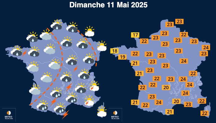 Enfin dimanche sera une belle journée sur toutes les régions du Nord et du Nord-est alors que les nuages seront assez présents dans l’Ouest et le Sud avec quelques orages sur les reliefs et la façade Atlantique. Mais les températures seront partout agréables l’après-midi.