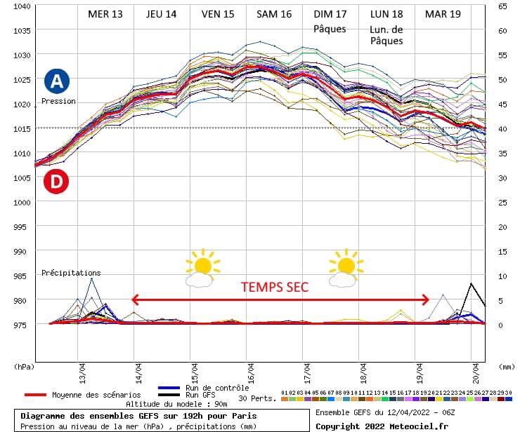 Le graphique ci-dessous montre les différents scénarios du panel du modèle américain en terme de pressions et de précipitations pour la semaine à venir (ici pour Paris). On constate que les pressions vont nettement remonter d'ici jeudi 14 avril 2022 avec une séquence anticyclonique se prolongeant jusqu'au Lundi de Pâques, avant que les pressions ne reculent par la suite. Nous allons donc vivre une séquence sèche, souvent ensoleillée et douce.