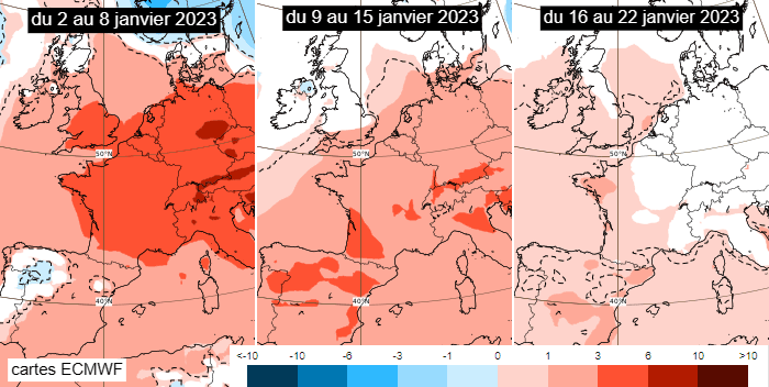 Ces projections sont corroborées par les tendances hebdomadaires du modèle européen. Cette semaine du 2 au 8 janvier 2023 devrait afficher une anomalie thermique proche de +4 à +5°C en France. Celle-ci s'atténuerait quelque peu en semaine du 9 au 15 janvier, s'établissant plutôt autour de +2 à +3°C. Elle s'estomperait encore en semaine du 16 au 22 janvier, se situant plutôt vers +1°C. Quoiqu'il en soit, il n'est pas modélisé d'anomalie froide avant au moins une bonne quinzaine de jours.
