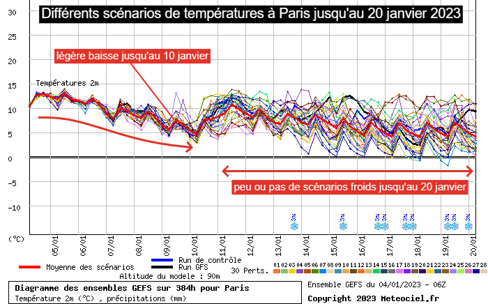 Prévisions des températures à Paris du 4 au 20 janvier 2023 selon les différents scénarios - via meteociel.fr