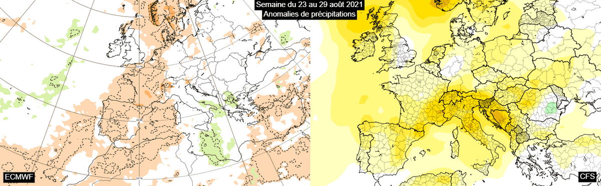 Anomalies de précipitations durant la semaine du 23 au 29 août sur la France – ECMWF et CFS