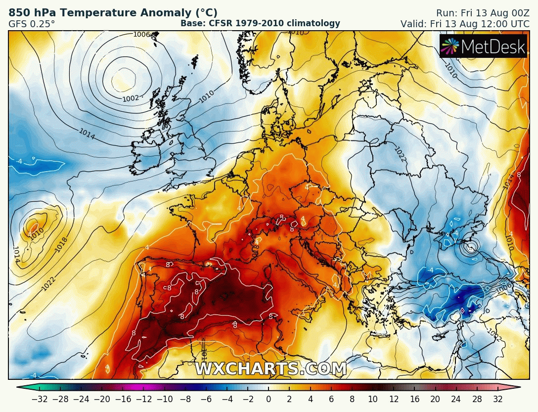 Animation des anomalies de température à 850 hPa sur l'Ouest de l'Europe du 13 au 20 août 2021 – Modèle GFS via WX CHARTS