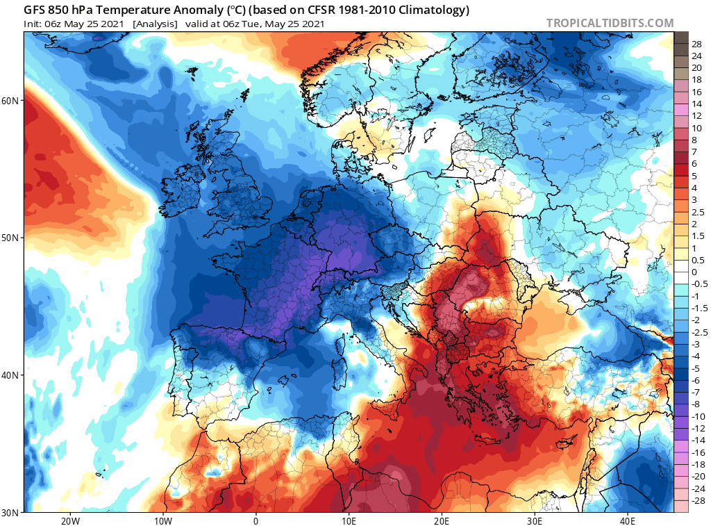 Anomalies de la masse d'air du mardi 25 au lundi 31 mai 2021 - via tropicaltidbits.com