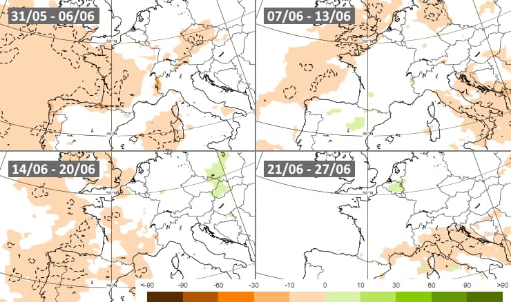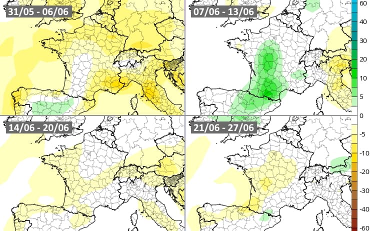 En résumé : les tendances pour le mois de juin misent sur des conditions bien plus agréables qu'au printemps et majoritairement estivales. Les températures seraient supérieures à la normale, notamment au sud, même s'il n'y a pour le moment pas de signal vers des chaleurs excessives. Les précipitations, quant à elles, seraient bien plus discrètes qu'en mai même si quelques salves orageuses semblent probables.
