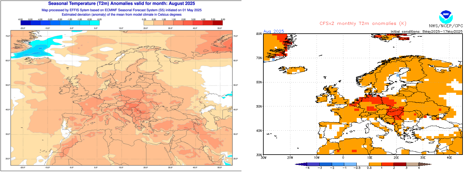 Anomalies de températures sur l'Europe pour le mois d'août 2025 – ECMWF et CFS
