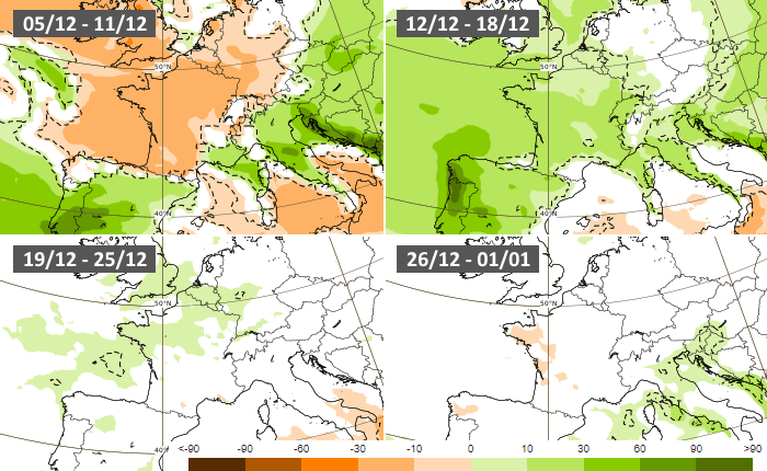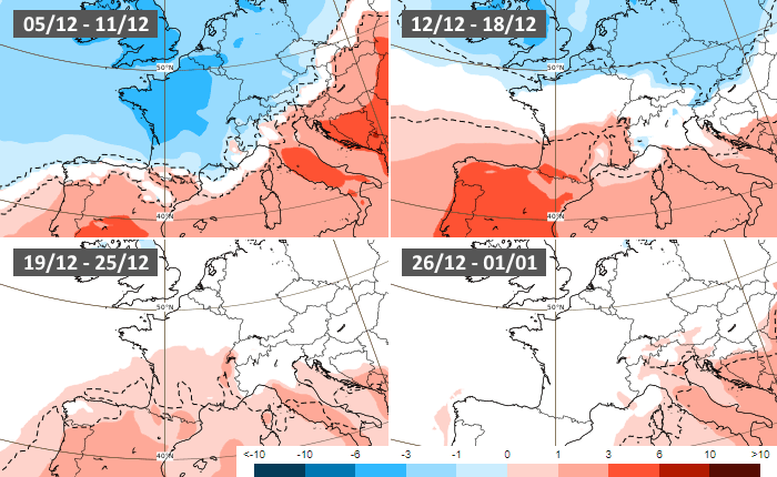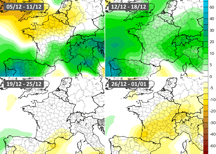 Après cette semaine relativement sèche (froid accompagné d'assez peu de précipitations), le modèle européen envisage un temps sensiblement plus instable au cours de la semaine prochaine. Comme un contraste thermique se produirait entre le nord et le sud, des anomalies dépressionnaires pourraient transiter au dessus de l'hexagone en produisant des fronts pluvio-neigeux. L'instabilité pourrait ensuite s'atténuer durant la dernière décade du mois avec un éventuel retour des hautes pressions pour la période des fêtes.