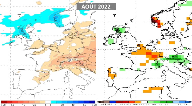 Du côté des précipitations, une tendance sèche se dégage pour ce mois d'août 2022. Les modèles européen et américain proposent le même scénario avec un manque de pluie plus net en allant vers l'est de la France. Le seul point de divergence est une possible tendance orageuse sur les régions alpines.