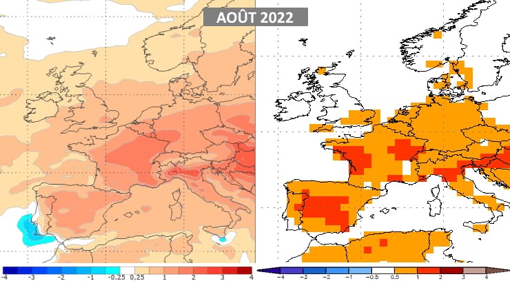 Modélisations des anomalies thermiques en août 2022 - modèle européen (via EFFIS) et américain (via NOAA)