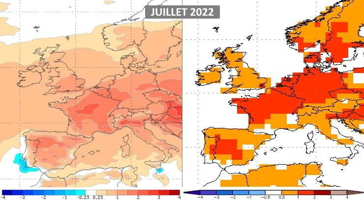 Modélisations des anomalies thermiques en juillet 2022 - modèle européen (via EFFIS) et américain (via NOAA)