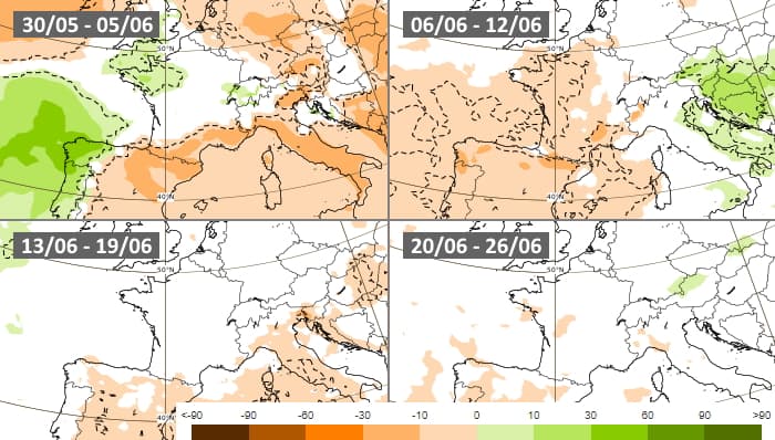 Les projections du modèle européen envisagent un début juin assez instable et orageux, à l'exception des régions méditerranéennes. Une tendance sèche se mettrait ensuite en place sur l'ensemble du territoire au cours de la semaine du 6 au 12 juin. Si aucune anomalie franche ne se dessine pour la seconde quinzaine du mois, il n'est pas prévu de séquences humides.