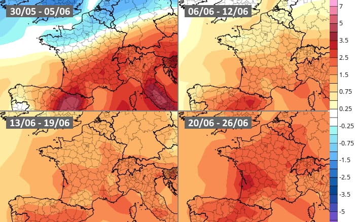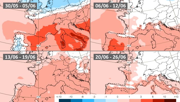 Les projections du modèle européen pour le mois de juin 2022 envisage un début de mois très chaud dans le sud de la France mais plus classique sur le nord du pays. La semaine du 6 au 12 juin resterait plus chaude que la normale au sud et à l'ouest, de saison au nord-est. La tendance chaude se généraliserait au cours de la semaine du 13 au 19 juin, persistant sans doute jusqu'au terme du mois.
