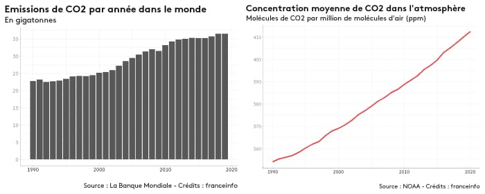 Émissions de CO2 et concentration moyenne dans l'atmosphère par année depuis 1990 - via France Info