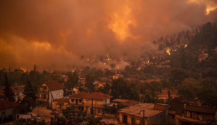 Le village de Gouvès sur l'île d'Eubée (Grèce) en feu le 8 août 2021 - photo AFP