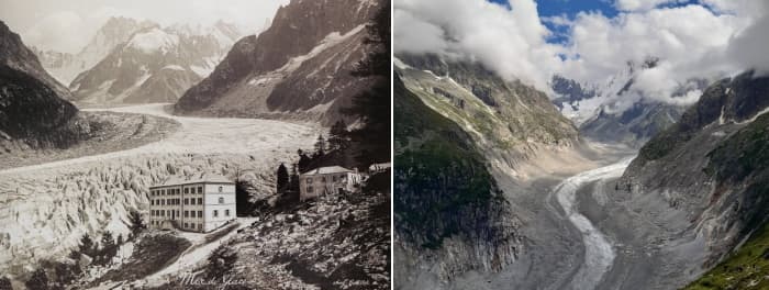 Évolution de la Mer de Glace dans les Alpes entre 1900 et 2021 - photo d'archive et Matthieu Sorel