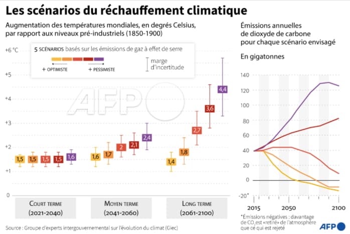 D'ici le milieu du siècle, le scénario médian (émissions de CO2 plus ou moins stables) envisage une hausse de 2°C de la température globale par rapport à la fin du XIXème siècle. Le scénario pessimiste (nette hausse des émissions de CO2) envisage une hausse de 2,4°C. Quant à la fin du siècle, le scénario médian modélise une hausse de 2,7°C tandis que le scénario pessimiste modélise une hausse de 4,4°C !