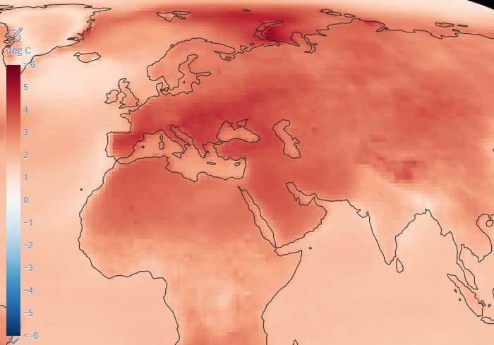 Les hautes latitudes de l'Arctique et les terres devraient se réchauffer plus rapidement que l'océan Atlantique, comme le montre la modélisation climatique ci-dessus. En France, c'est le sud qui se réchaufferait le plus vite avec une augmentation de près de 4°C d'ici 2100 tandis que celle-ci serait plutôt de 2°C en allant vers la Manche.