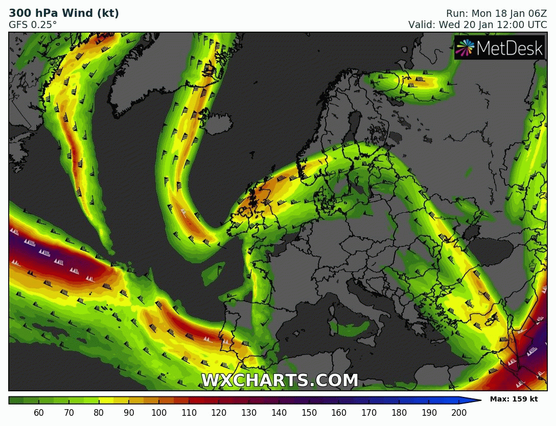 Animation de l'évolution du Jet Stream entre mercredi 20 et samedi 23 janvier sur l'Ouest de l'Europe - Modèle GFS via WX CHARTS