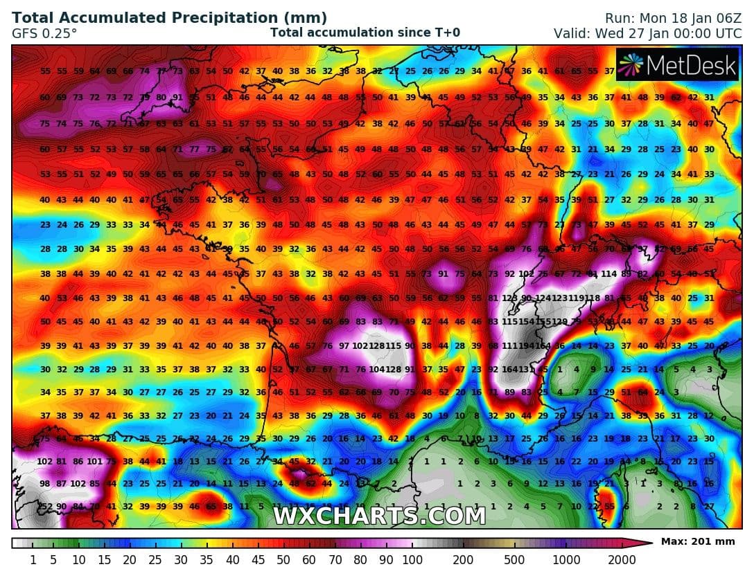 Cumuls de précipitations totaux envisagés jusqu’au mardi 26 janvier sur la France – Modèle GFS via WX CHARTS