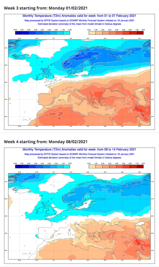Anomalies de températures envisagées pour les semaines du 8 au 14 février prochain (cliquez sur l'image pour l'agrandir) – Via EFFIS