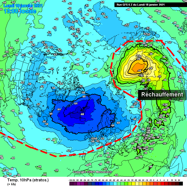 Températures à 10hPa (stratosphère) au-dessus de l’hémisphère Nord en ce lundi 18 janvier 2021 – via météociel.fr