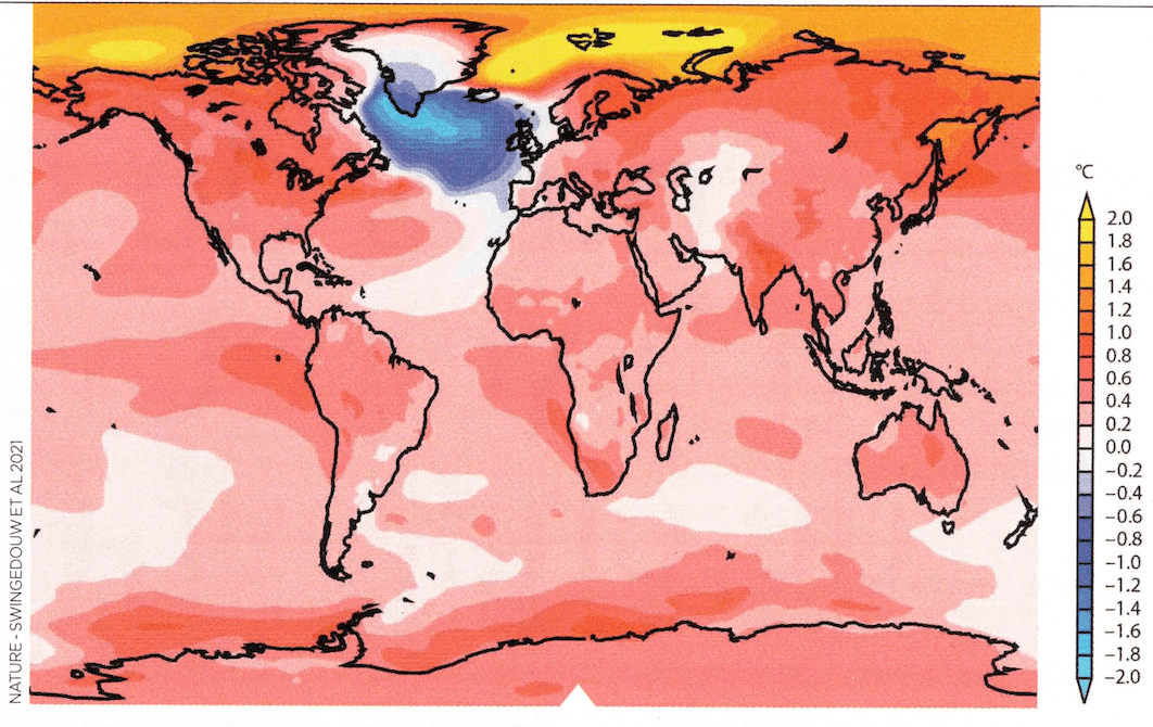 Selon certaines études, l'Islande serait l'une des seules terres qui pourraient se rafraîchir dans les prochaines décennies. Ces dernières indiquent que la fonte des glaces polaires amenant de grandes quantités d'eau douce dans le nord de l'Atlantique est susceptible de générer un effondrement du gulf stream, courant océanique qui réchauffe le climat de l'ouest de l'Europe. Ainsi, les températures baisseraient dans le nord de l'Atlantique et notamment entre Groenland et Islande.