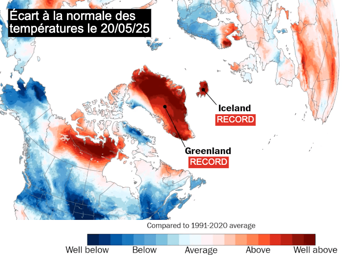 Depuis la mi-mai 2025, l'Islande subit des températures remarquablement élevées pour la saison. C'est également le cas d'une grande partie du Groenland. Des records de douceur/chaleur ont été battus dans ces territoires au cours des derniers jours avec des valeurs parfois inédites pour un mois de mai. Dernièrement, il faisait parfois plus chaud en Islande qu'en Espagne !