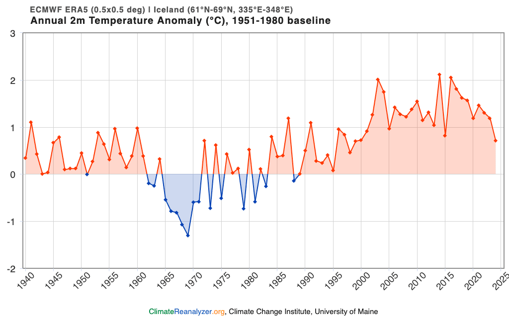 Anomalie thermique annuelle moyenne en Islande de 1940 à 2024 - climatereanalyzer.org