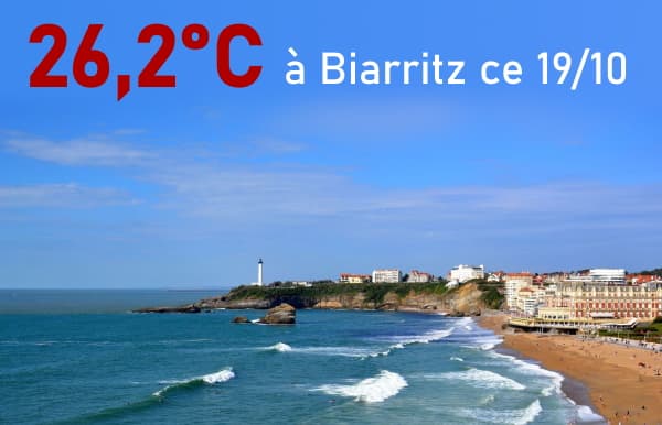 Au pied des Pyrénées, cette configuration est très favorable à l'effet de foehn, un assèchement et un réchauffement important de la masse d'air lorsque les vents violents soufflent sur le relief pyrénéen et qui se manifeste sur le piémont. C'est ainsi que la température maximale a atteint 26,2°C à Biarritz ce lundi 19 octobre 2020.