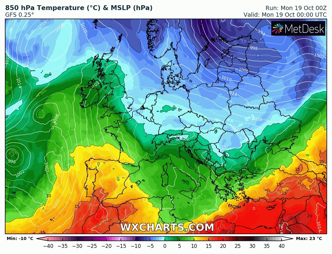 Évolution de la masse d'air du lundi 19 au vendredi 23 octobre 2020 - via wxcharts.com