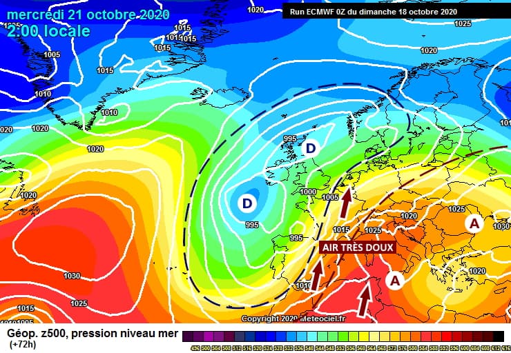 Situation à échelle continentale le mercredi 21 octobre 2020 - modèle CEP via meteociel.fr