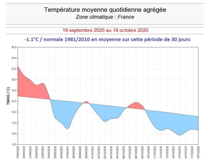 Sur la période de 30 jours englobant la dernière décade du mois de septembre et les deux premières décades du mois d'octobre, l'anomalie thermique en France est de -1,1°C. C'est la première fois depuis plus de 500 jours qu'une anomalie déficitaire atteignant au moins 1°C est observée dans notre pays (la dernière fois en mai 2019) !