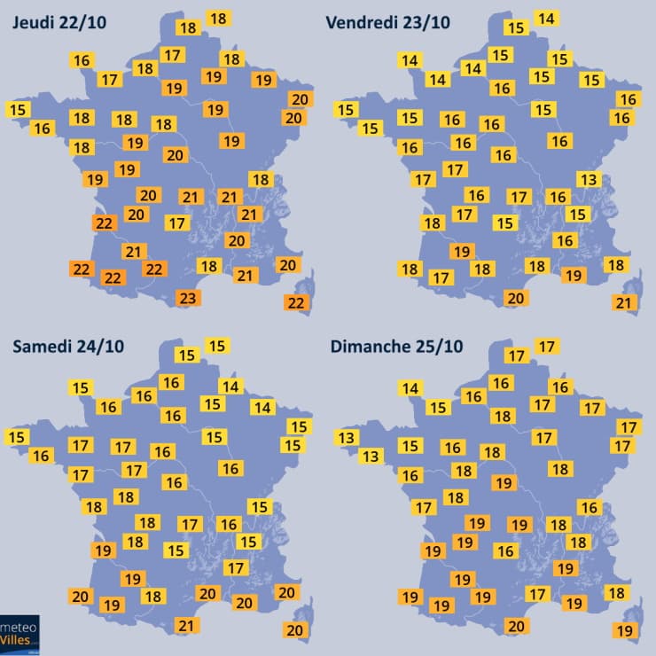 Températures maximales prévues du jeudi 22 au dimanche 25 octobre 2020 - Météo Villes