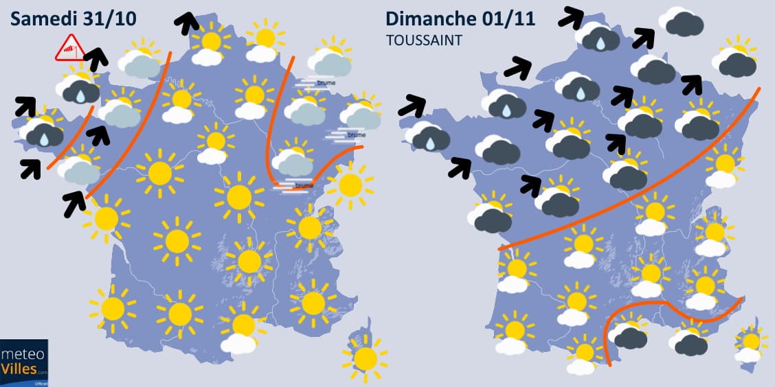 Le soleil reviendra sur l'ensemble de la moitié sud dès la journée du vendredi 30 octobre mais la plus belle journée de la semaine sera celle du samedi 31 octobre. Le matin, les nuages bas seront fréquents sur la moitié nord, dans les plaines du sud-ouest et les vallées du centre-est. Ils se dissiperont en après-midi au profit d'un soleil généreux presque partout (grisaille très localement tenace vers le val de Saône ou la plaine d'Alsace). La Bretagne fera toutefois exception avec l'arrivée d'un front pluvieux associé à un vent fort.