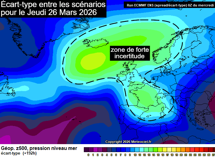 Si les modèles américain et européen allaient dans le même sens lors de leur dernière mise à jour, ils soufflent le chaud et le froid ces derniers jours avec des scénarios très fluctuantes. Et pour cause, les incertitudes sont encore très importantes. La carte ci-dessous montre l'écart-type entre les différents scénarios pour le jeudi 26 mars 2026, date autour de laquelle débuterait la coulée froide. On remarque que c'est entre l'Islande et la France que les scénarios divergent le plus fortement, prouvant que l'ampleur - et même la survenue - de cette coulée froide restent soumises à d'importantes incertitudes.