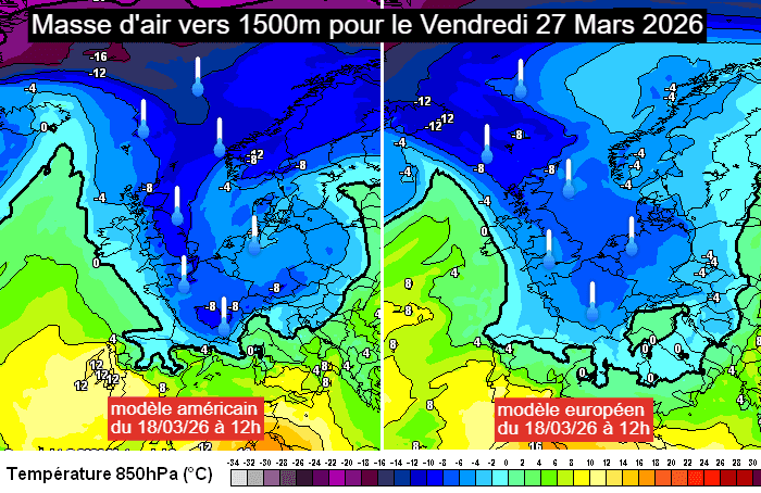 Scénarios de masse d'air à 1500m pour le vendredi 27 mars 2026 - meteociel.fr