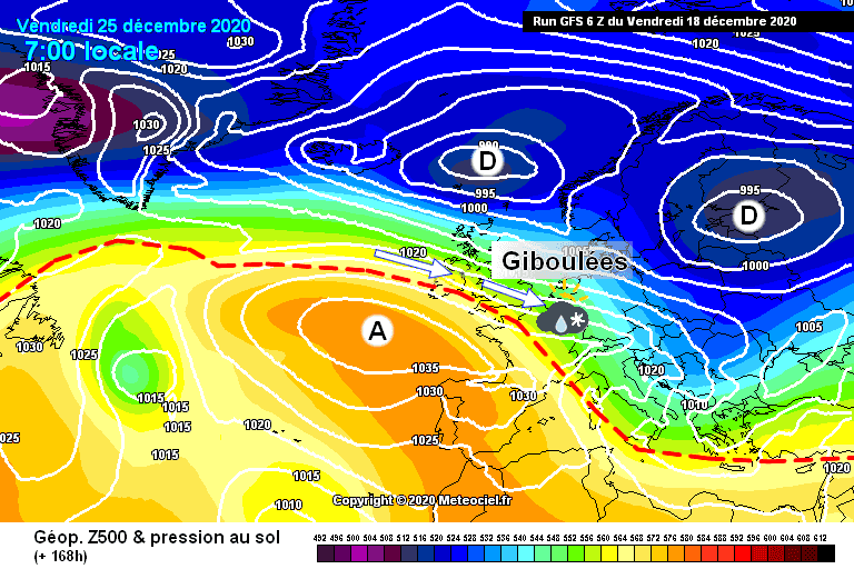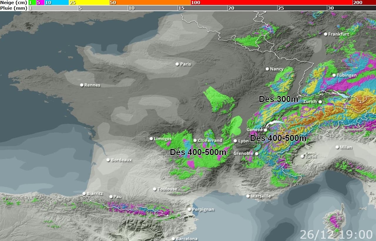 Ce scénario semble prendre un peu d’embonpoint dans les dernières modélisations  avec une situation possiblement très dépressionnaire et froide envisagée après le 27/28 décembre. Un large système dépressionnaire pourrait en effet plonger sur le pays par le Nord/Nord-Ouest, apportant un froid plus humide et un risque d’épisode neigeux plus étendu jusqu’en plaine.