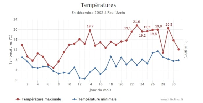 Températures minimales & maximales à Pau-Uzein (64) au mois de décembre 2002 - via infoclimat.fr