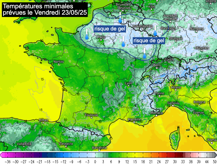 Avec cet air froid en altitude et des nuages devenant plus discrets, un risque de gel va se développer sur le nord et le nord-est de la France en fin de nuit et début de matinée du vendredi 23 mai 2025. Le risque devrait surtout s'étendre de l'est de la Normandie vers la Lorraine. Dans certaines campagnes, des valeurs de 0 ou -1°C sont modélisées.