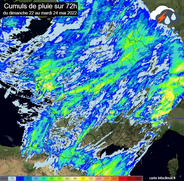 Cumuls de précipitations sur 72h du dimanche 22 au mardi 24 mai 2022 - via infoclimat.fr