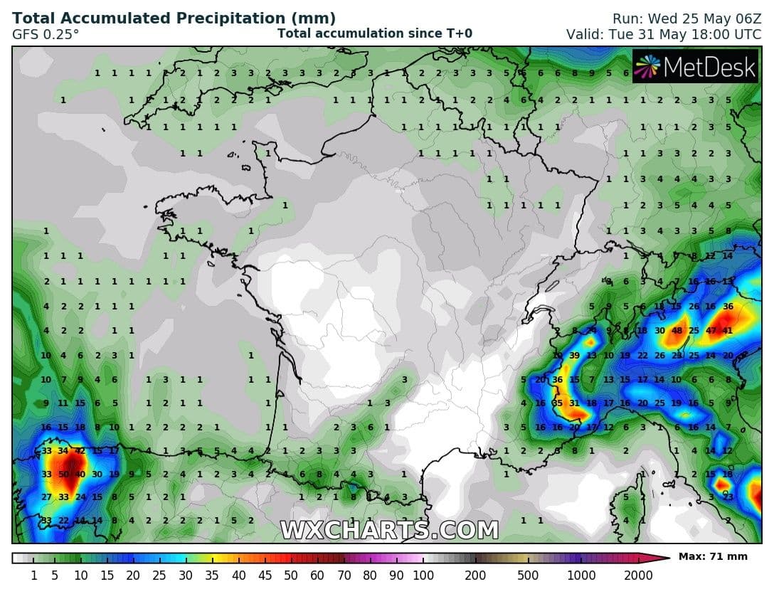 Cumuls de pluie prévus par le modèle américain jusqu'au mardi 31 mai 2022 - via wxcharts.com