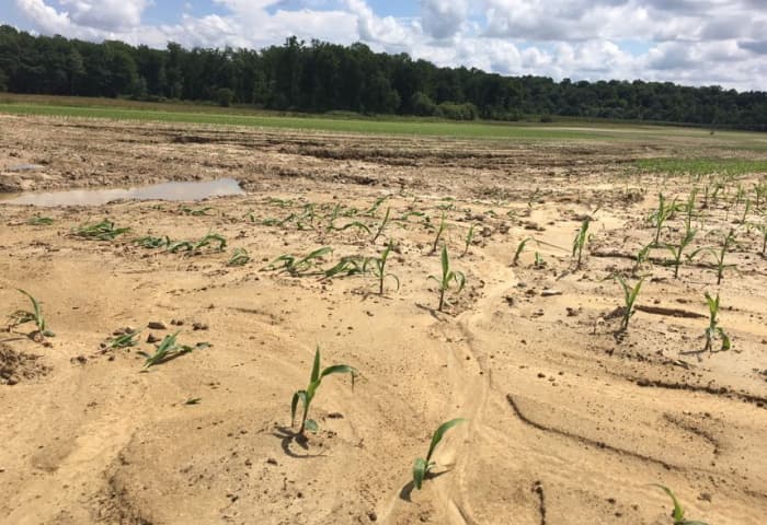 Illustration du ruissellement dans un champ de maïs après un orage - photo Renaud Biondo-Mauget