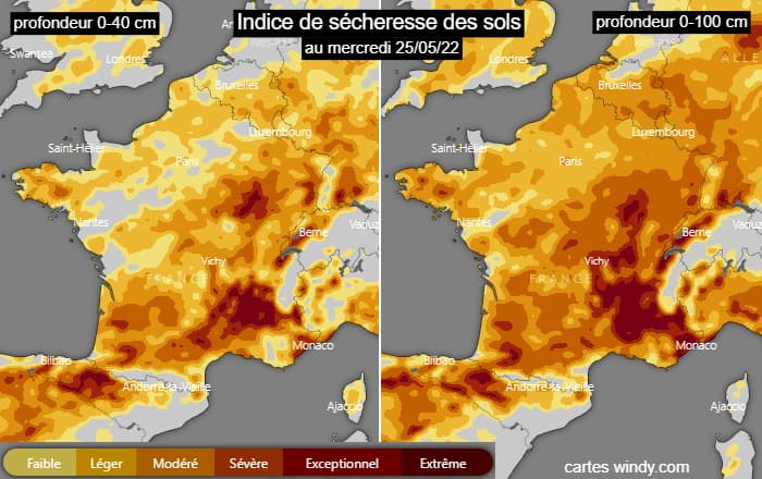 Sécheresse des sols au mercredi 25 mai 2022 à une profondeur de 40 cm et d'1 mètre - via windy.com
