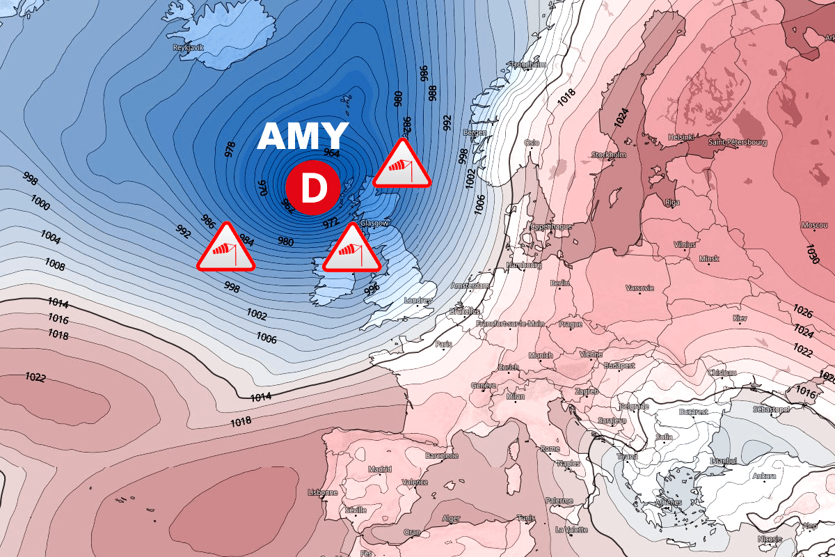 Boostée par un puissant courant jet en altitude, la tempête Amy s'annonce particulièrement virulente sur le nord des Îles Britanniques. Ce sont d'abord les côtes nord et l'ouest de l'Irlande qui subiront des rafales à plus de 100 km/h dès l'après-midi de vendredi mais les plus violentes rafales souffleront sur l'Écosse en soirée et jusqu'en nuit suivante. Elles pourront alors atteindre les 150 km/h sur les littoraux exposés et les hauteurs des Highlands ! En mer, des valeurs de 150 à 180 km/h sont modélisées !